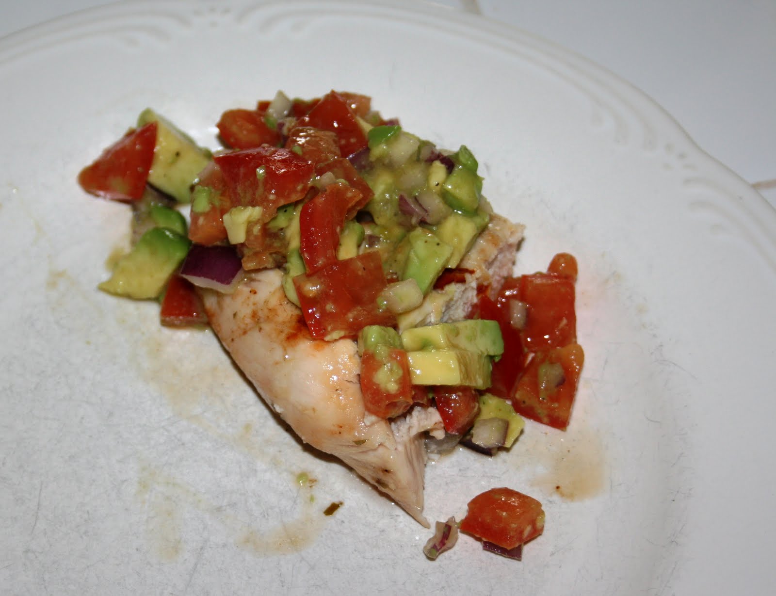 2. To prepare salsa, combine tomato, red onion, lime juice, salt & pepper in a medium bowl. Add avocado; stir gently to combine. Serve salsa over chicken.